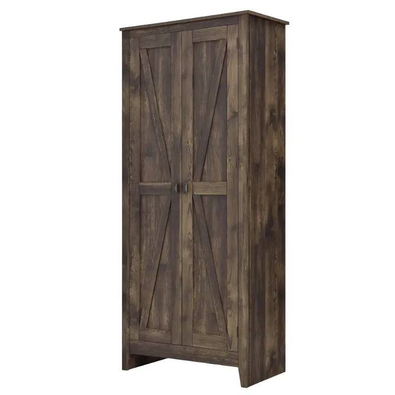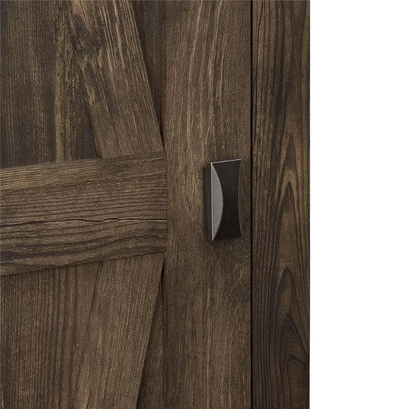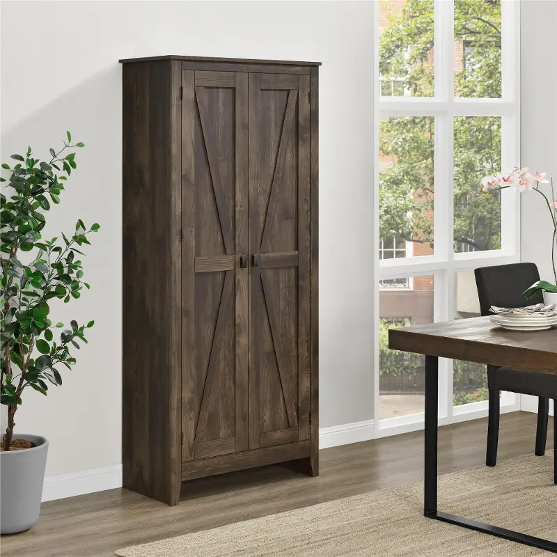 5” Wide Storage Cabinet is a stylish way to stay on top of your organization. The rustic barn style design and sleek tapered feet gives the look of an old weathered cabinet but the sturdy laminated particleboard and MDF make this cabinet the perfect piece to house your home office supplies, extra linens, seasonal clothing, nonperishable food and more!