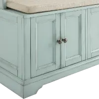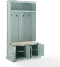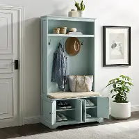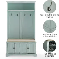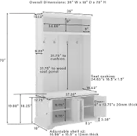 Featuring a sizable bench and two storage cabinets with adjustable shelves, you can easily sit down and tuck away your shoes at the end of the day. The open stationary shelf corrals smaller items while the four double-prong hooks keep coats and hats accessible. Whether you are coming or going, the Holbrook Hall Tree keeps all your everyday items close at hand.