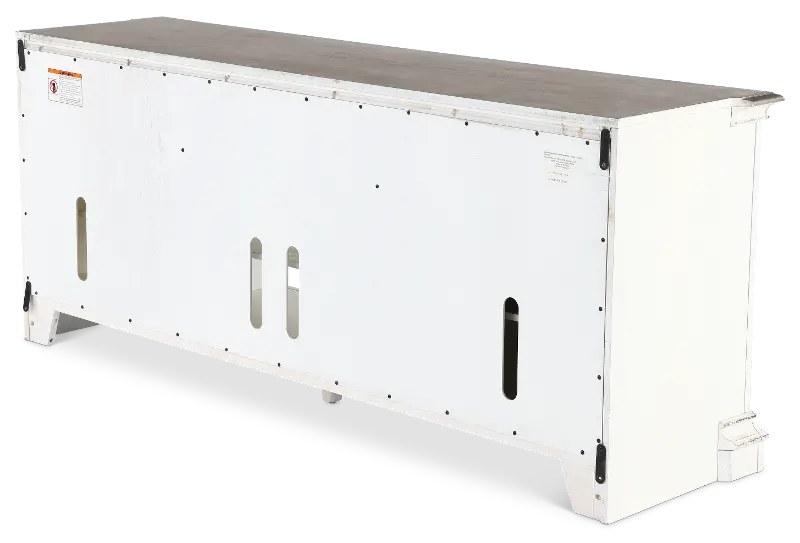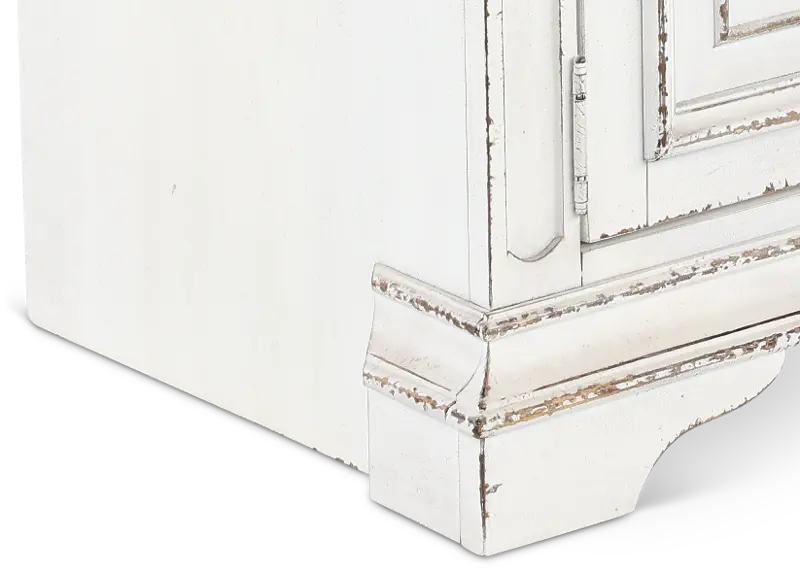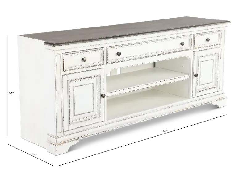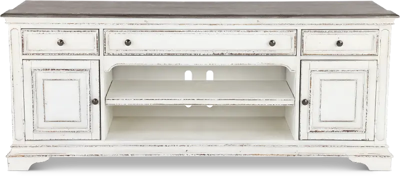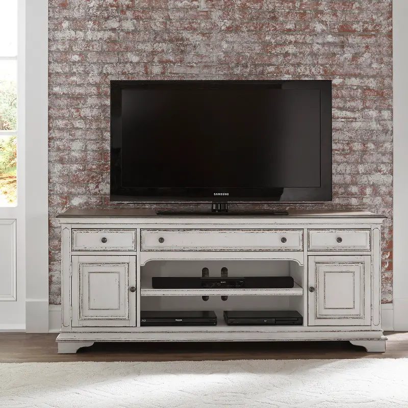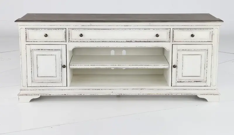 This antique white 70" TV stand from the Magnolia Manor collection provides a perfect new home for your entertainment devices.