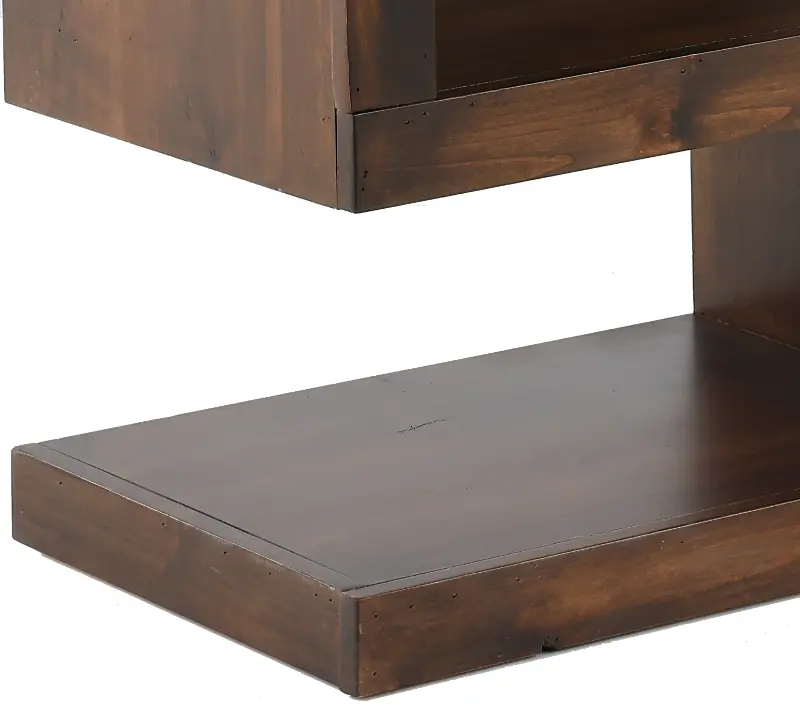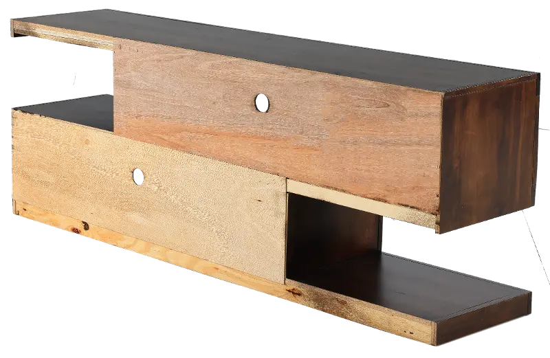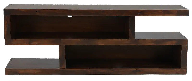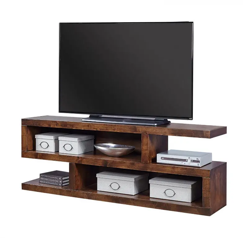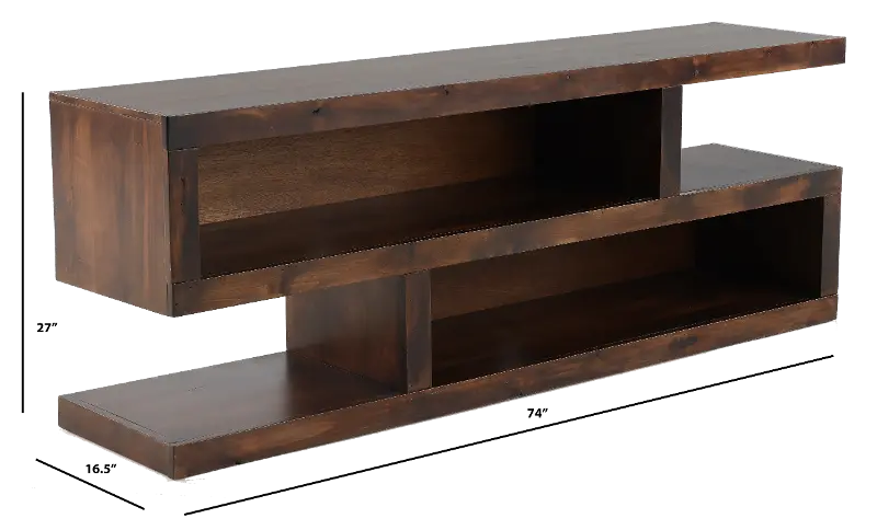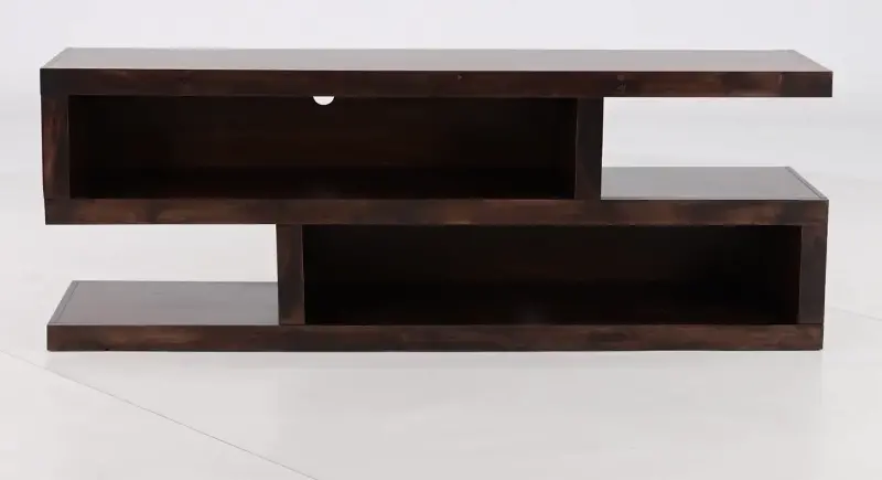With a sleek structural build, asymmetrical shelves and two open cubby spaces, this piece gives you the flexibility to store and display your media collection and objects any way you choose. Straight lines and a rich tobacco finish make this a worthy addition to any modern living space. Make your living room a place to gather and relax in comfort and style.