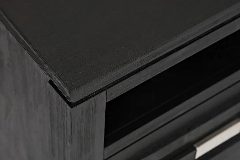 This TV stand features plenty of media storage solutions made of Acacia and veneers. With bold silver hardware and the perfect balance of open and closed storage, this piece brings a whole new dimension to your space.