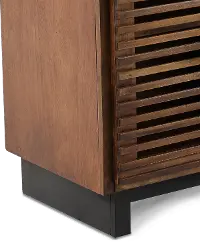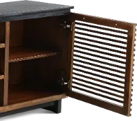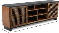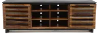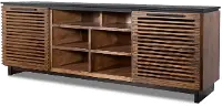 The natural wood grain color variations ensure no two pieces are the same, and this is accentuated by the unique linear design of the slatted cabinet doors. Six open shelves include cord management cutouts to help keep all your media devices organized. The black base and top contrast against the bourbon finish of the shelving and cabinets, making this piece truly one of a kind!