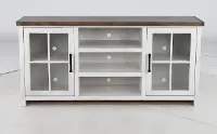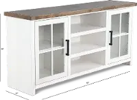 The clear-front cabinets are perfect for displaying your keepsakes, with pretty of shelving for your entertainment devices. The crisp, Jasmin white finish contrasts the natural beauty of the wood grain top. The piece is brought together with the classic black hardware on each cabinet. This piece accommodates TVs up to 75 inches for all your late-night movies and sports game viewing parties.