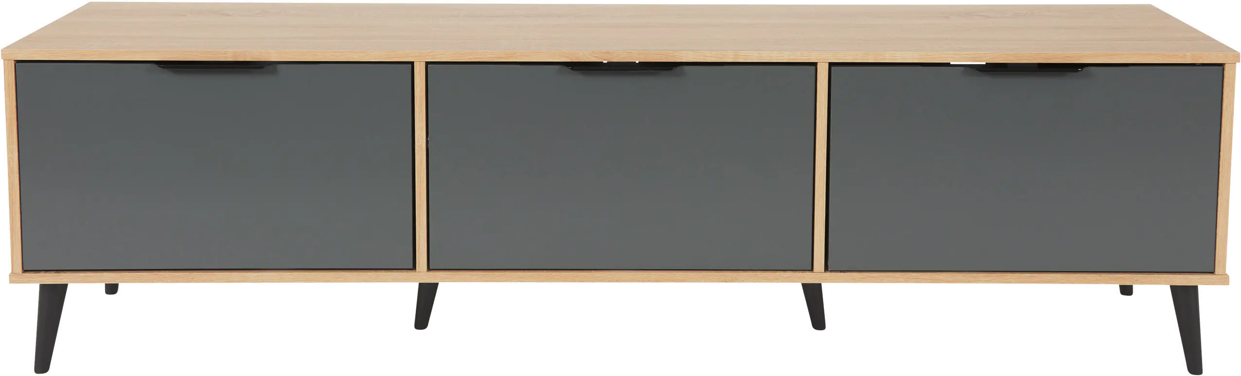 It includes 6 shelved storage compartments concealed by 3 cabinet doors for all your media needs. The modern bench will keep your living space tidy and organized in a clean, minimalist style. The quality shelves are built to last with a durable high-grade wood finish throughout the interior. Its wire management keeps your cords neat and tangle-free, while non-marring nylon nail glides protect your floors and surfaces from scratches. Smartly designed to hold televisions up to 85 inches, it's still compact enough to fit most spaces in your home.