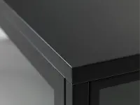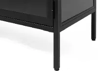 This metal three-door tv stand is designed with three glass panel door fronts, two shelves, and simple black metal framework, making it the perfect home for your favorite pottery, books, and other collected curiosities. The perfect height to use as a sophisticated TV stand, or just extra display items. Includes a wire management cutout in the back. The design is timeless and complements any range, color or texture so feel free to mix it up with both natural wooden colors, darker smoked stains, and bold colors from fabrics or simply use it as a “stand-alone” statement piece.