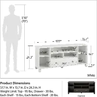 Two shelves are adjustable giving you the freedom to customize your component placement how you see fit. The lower drawer is an excellent storage solution for cords, remotes, or to stow away a blanket to cozy up to on movie nights with loved ones. The TV Console requires assembly and two adults are recommended to assemble. Once assembled, the Stand measures to be 57.72" W x 15.67" D x 24.29" H.