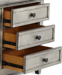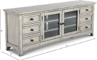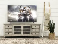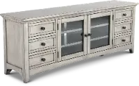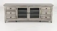 The weathered modern gray finish will add a classic, cozy design to your living room decor. Keep your consoles organized behind the glass-front doors on adjustable shelves. Remoted, manuals, and more stay neatly tucked away thanks to the six sliding storage drawers. Add your favorite TV up to 75" and you'll be ready for your next movie night!