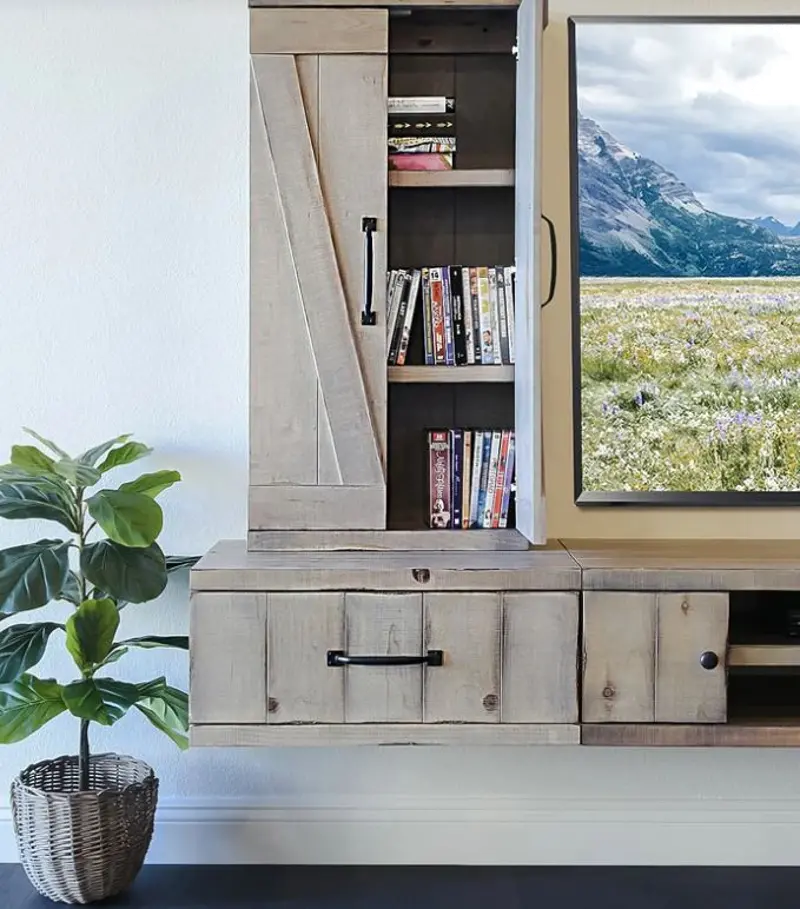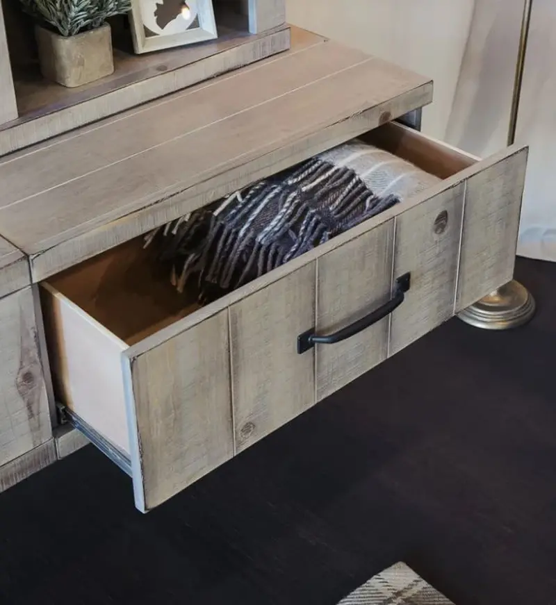 The FARMHOUSE is a unique rustic floating console meticulously handcrafted from REAL wood.