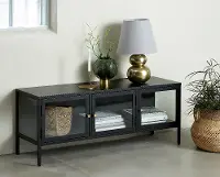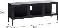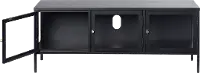 It features three glass panel door fronts, two shelves, and black metal framework. Polished brass accent pieces add a touch of class. Perfect for use as a TV stand or a modern way to display your favorite books, flowers, and decor. A large cable outlet opening allows you to keep wires safely and neatly tucked away.