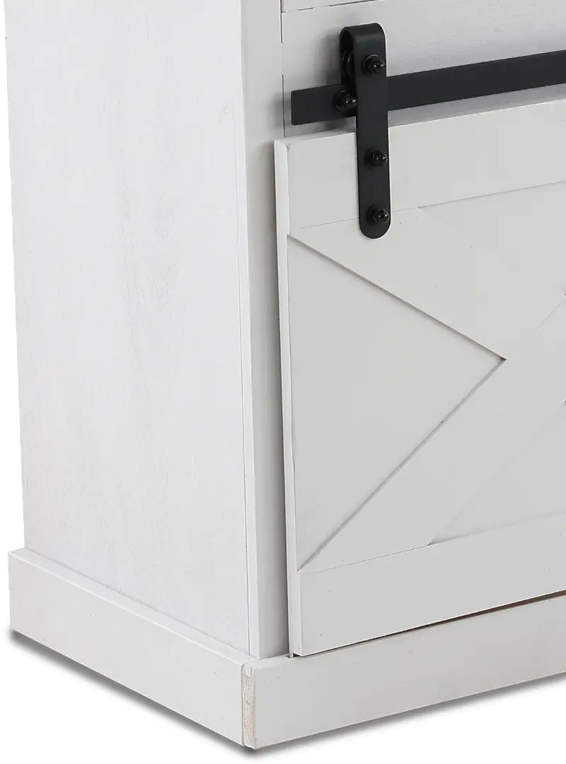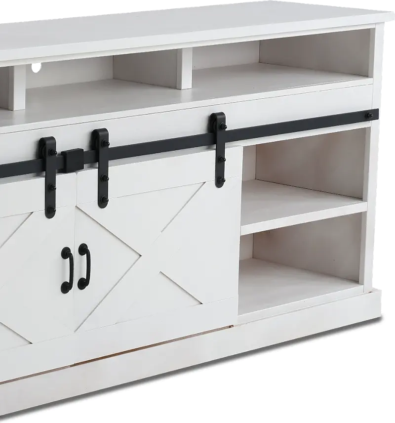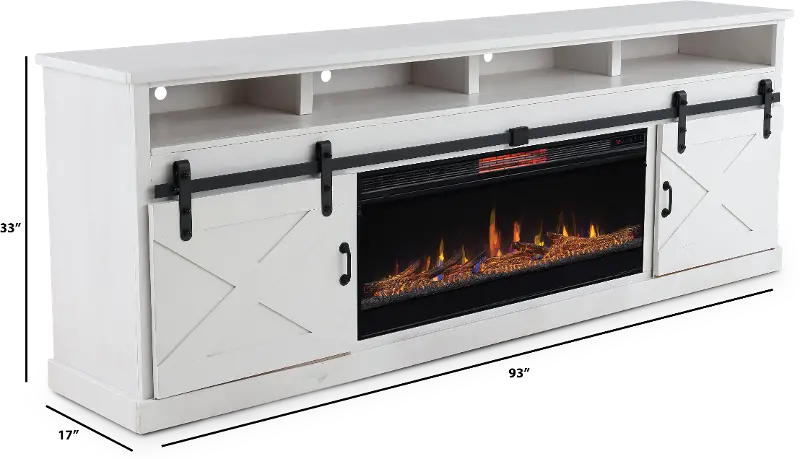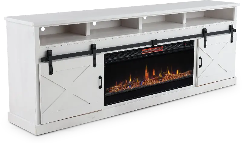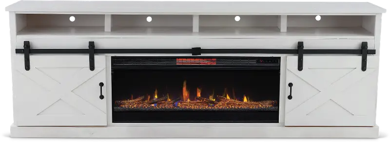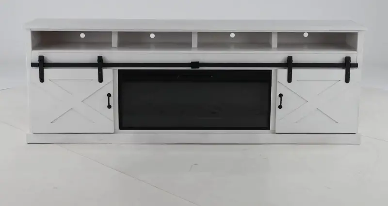 With a lightly distressed Jasmin white finish, this piece adds a modern rustic touch to any living space. Add cozy charm to your living room and warm up to 1000 square feet of space with the electric fireplace. Hide it when not in use with the sliding barn doors! This piece also features a wire management system and ample storage space. Bring it home today and make the most of your living room!