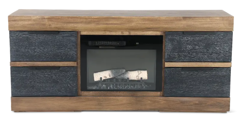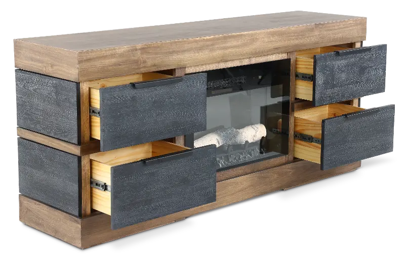 Four drawers painted in a satin black finish offer room for storage while standing out against the rich brown frame. The glowing electric fireplace invites ambiance and warmth while heating up to 1000 square feet. Crafted of solid pine and poplar wood, it will be the centerpiece of your home.