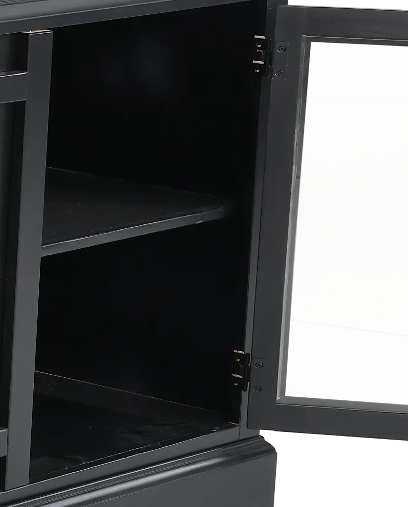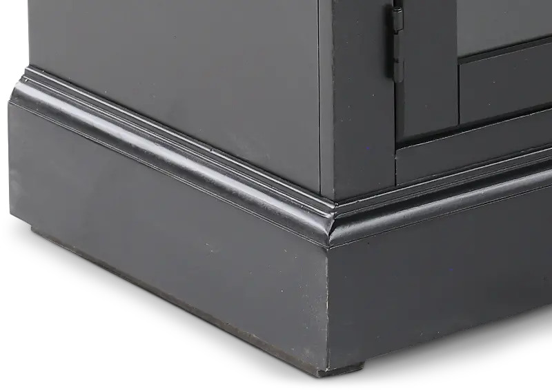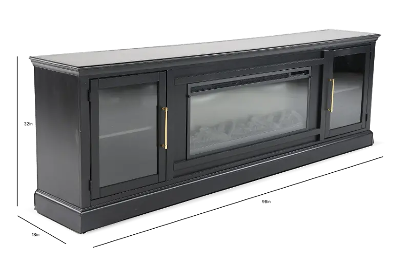 This spacious 98" piece features a sleek black finish that is complemented by handsome metal hardware door pulls. Four glass front cabinets make it easy to store media and gaming consoles on the fixed shelves, while cord management cutouts help keep wires neatly tucked away. Two display shelves make a great space to set up your favorite books and decor. Enjoy the warmth and glow of the built-in fireplace that features timer settings, color options, temperature control, ember bed choices, zone heating, and flame effect.