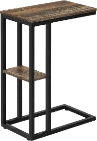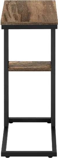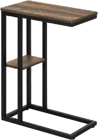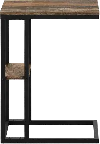 The rectangular tabletop in a medium brown reclaimed wood-look finish is supported by a black metal frame with a secondary shelf underneath the table for convenient placement of smaller items. Slide this versatile end table under a sofa or chair to place snacks or mobile devices or use as a side table next to a bed.