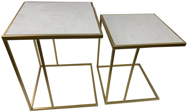 This set of nesting end tables is finished in a gold frame with a marble tabletop that will add a little glamour to your home decor. Easily tuck the smaller table under the larger table when you need more space, or separate the two when you need extra surface area for drinks, snacks, or your morning coffee. Place this end table set next to your favorite reading chair or sofa to complete your living room design!