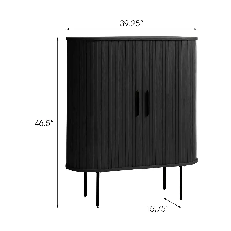 Showcasing a warm brown color, the soft rounded edges offer plenty of room to display your favorite books, decor and collectibles. Vertical line details on the base add visual interest and a modern touch. Gliding tambour doors easily open down the side of the table, revealing two adjustable shelves for storage. Match with other items in the Nola collection to refresh the look of your home today.