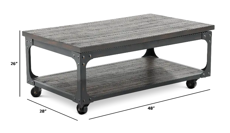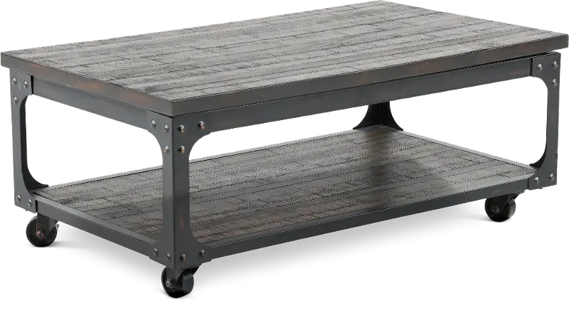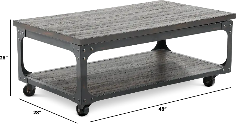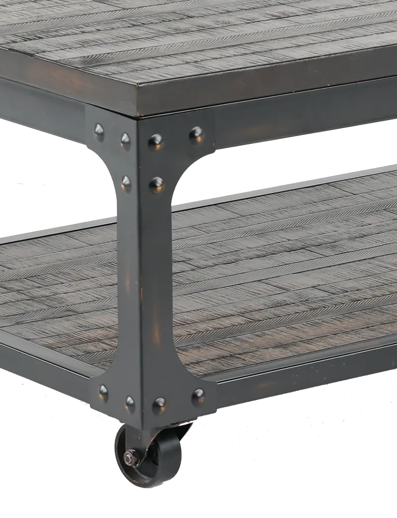 Constructed from heavily distressed hardwood solids in a rustic tobacco finish and accented by an iron frame base, this piece is a perfect balance of industrial, rustic, and antique style. Metal riveting and cross-stretchers finish off the look of this perfectly! Add the matching end table and overhaul the look of your entire room.