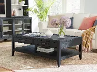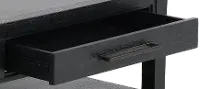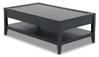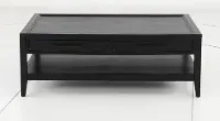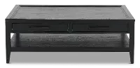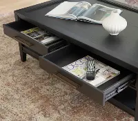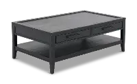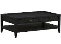 The sleek black finish will add a perfect pop of contrast to your space. With two full-extension storage drawers, a large lower shelf, and a raised lip around the tabletop, this coffee table is as practical as it is stylish. Keep remotes, manuals, and more organized and ready whenever you need them. Use this showstopper on its own or pair it with the rest of our Callahan collection for a complete living room design!