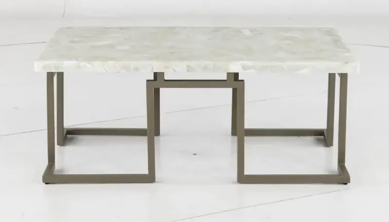 The geometric steel base is finished in a soft gold, accenting the natural onyx of the tabletop. Place this table in your living room for an accent piece that is sure to be a show stopper. Use this table on its own, or pair it with the rest of our Manhattan collection for a complete living room design!