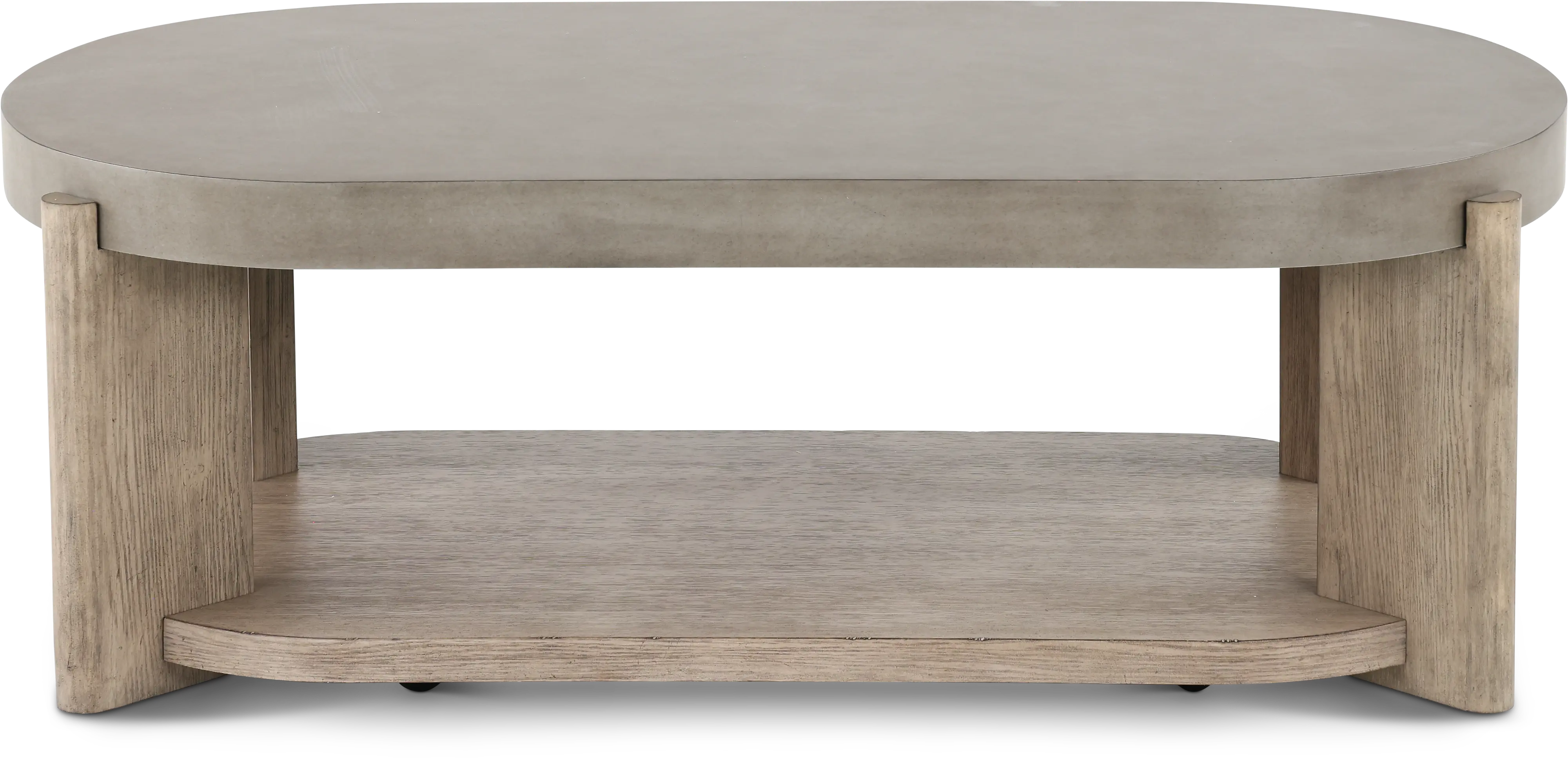 The faux concrete tabletop is accented by the wood grain details of the oblong table legs and lower base. Keep home decor, coffee table books, and more on the full lower shelf. Plus, hidden rolling casters help provide smooth maneuverability. Check out the rest of our Affinity collection to create a full sleek and stylish accent table set!