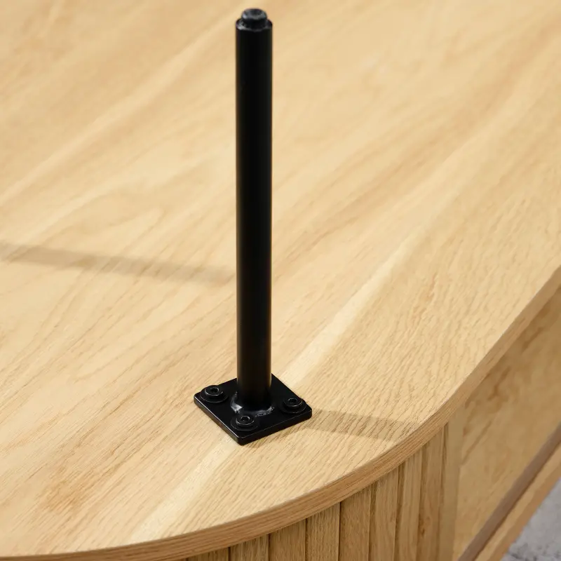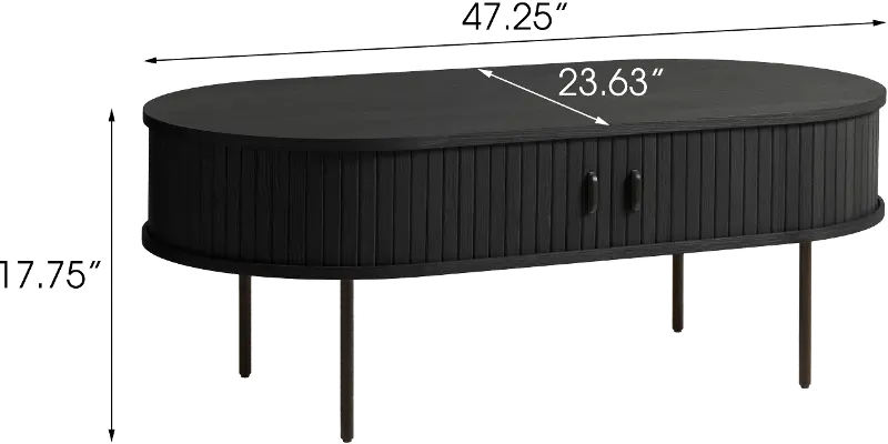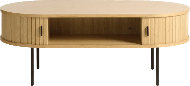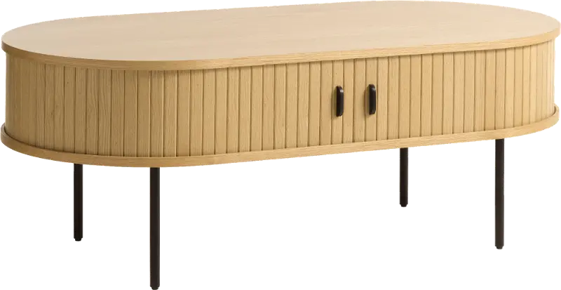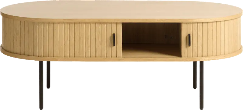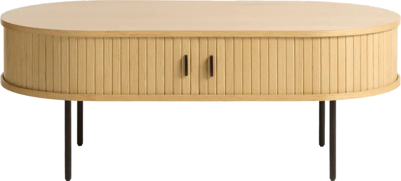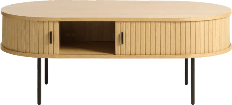 Showcasing a warm honey color, the smooth round tabletop offers plenty of room to display your favorite books and decor, or just to put your feet up! Vertical line details on the base add visual interest and a modern touch. Gently gliding tambour doors reveal convenient interior storage. Bring something special home with this piece today!