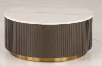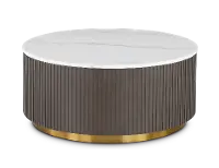 The smooth round shape highlights natural veining on the genuine white marble tabletop and adds a light, clean look to any room. The ribbed design in the table frame is brought out by the rich charcoal finish, creating texture and depth. A brushed gold metal base brings a luxurious touch. Complement this piece with the matching end table from the Janson collection, and refresh your living space today!