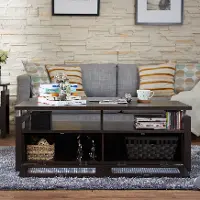 This contemporary storage coffee table comes with two spacious cabinets and two open shelves for plenty of storage. It offers a rich espresso finish and features metal hardware and accents as well as solid block legs for added stability.