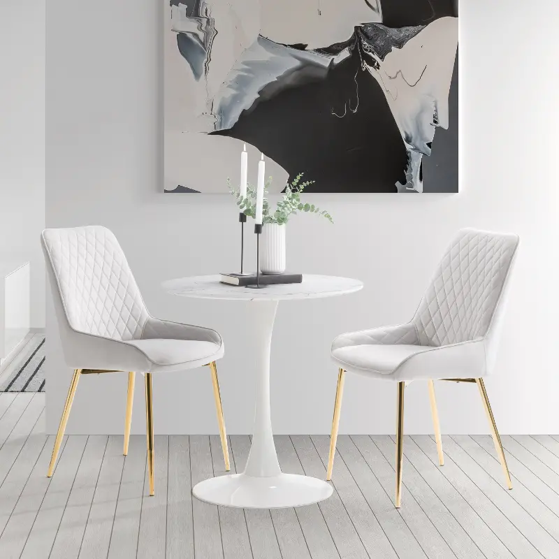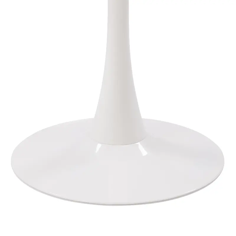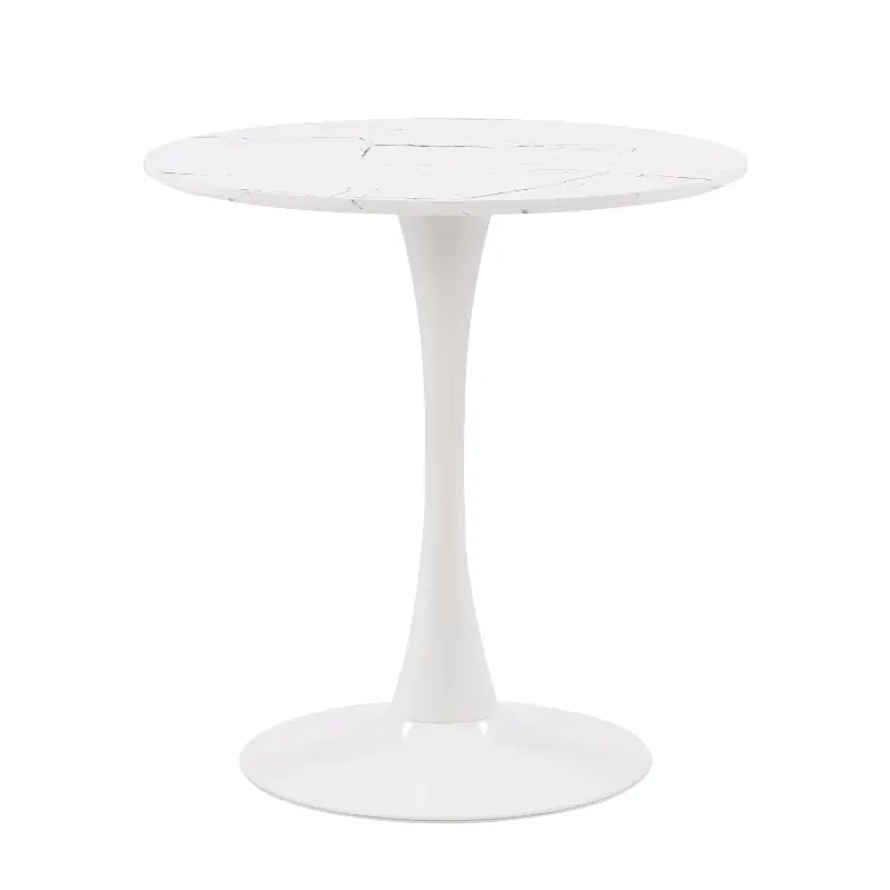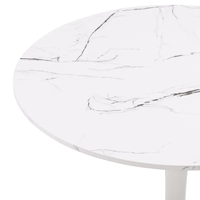 This table is a stylish centerpiece for your dining room or eat-in kitchen ensemble. A sturdy white metal pedestal base with a circular marble-designed top adds style to your dining space. Its mixture of materials makes it ideal for both classic and contemporary aesthetics, while the marble top makes the perfect foundation for any table decor.