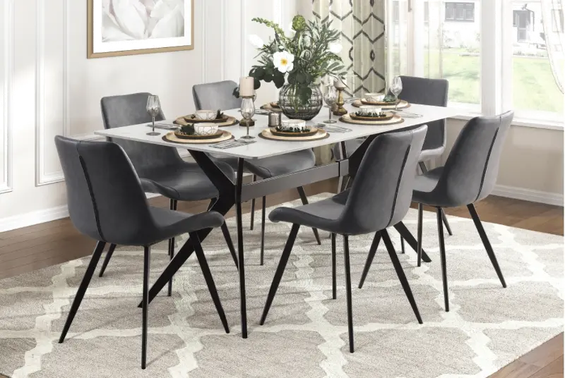 A striking blend of modern design and timeless style, this dining table features a veined white sintered stone top and a black metal base. Its sophisticated, stylish feel will set an inviting backdrop for your mealtime gatherings.