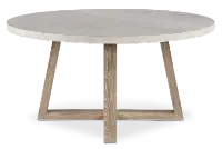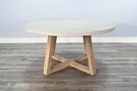 This sturdily built 60" round dining table beautifully blends gray and wheat wood tones with a minimalist design to bring comfort and balance to your dining areas.