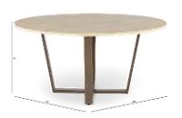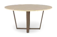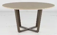 It features a 60" round top finished in a biscotti tan finish with the look and feel of wood. Its eye-catching crossed metal base features a rich bronze finish, creating a captivating focal point.