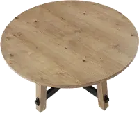 This 54" round dining table is the embodiment of contemporary lodge design with its clean lines and Craftsman-inspired detailing. Its driftwood finish beautifully highlights the natural grains of the wood, while contrasting black stretchers further enhance its eye-catching appeal.