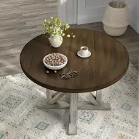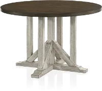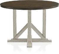 This farmhouse-inspired dining table is a charming choice to center your breakfast nook or dining room. It shows off an eye-catching, high contrast, two-tone finish that pairs an antique white base with light distressing with a gorgeous round tabletop in dark oak with wood grain detailing. The pedestal base is a unique design that nods to trestle design as it adds richness and character.