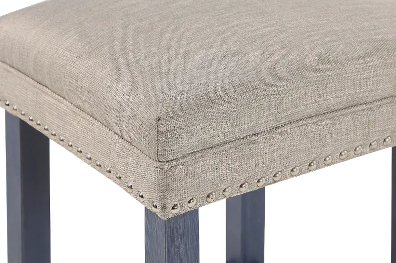 Its versatile design features a long, narrow table complete with three stools. They feature a compelling blue finish, while the stools offer comfortable upholstered seats with nail-head trim.