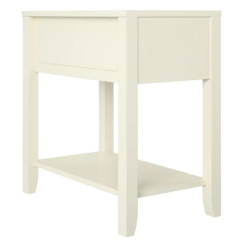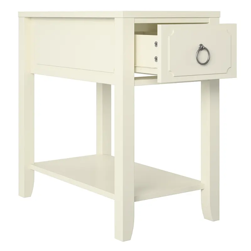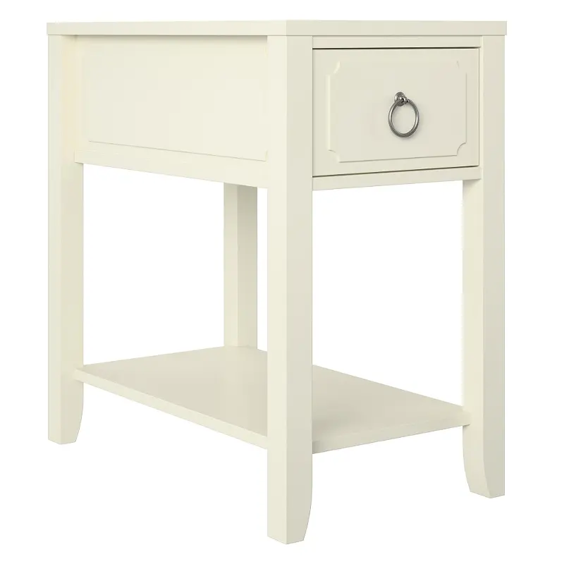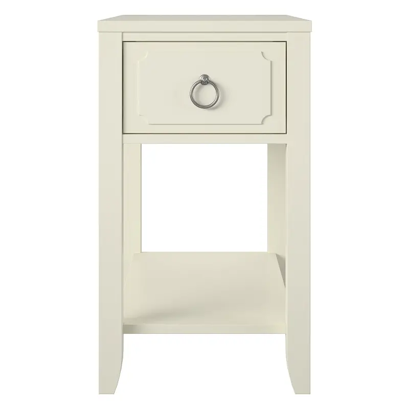 Available in several calming colors and constructed from painted MDF, this essential piece will look stunning in the living room next to a sofa, in the bedroom, or in any room of the house. This side table features a decorative drawer front with a complementary ring drawer pull that exudes a clean and sophisticated vibe. Keep items handy but tucked neatly away in the convenient drawer, and place photos or décor on the open shelf below. Complete the look with the entire Majesty Collection.