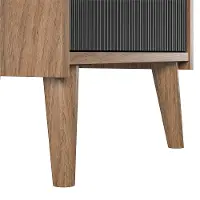 - Midcentury Modern black ribbed accent panels on engineered wood laminated in a walnut finish