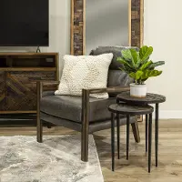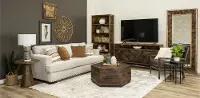 The rustic hand-finished tabletop is framed in a textured metal base. Each table can be used independently or nested together. This showstopper stands strong on its own, or can be paired with the rest of our Upton collection for a complete living room design!