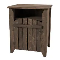 Durably crafted, this end table features handy storage space. Its finished in a reclaimed oak and offers a slatted door with a metal lock, further enhancing its down-home charm.