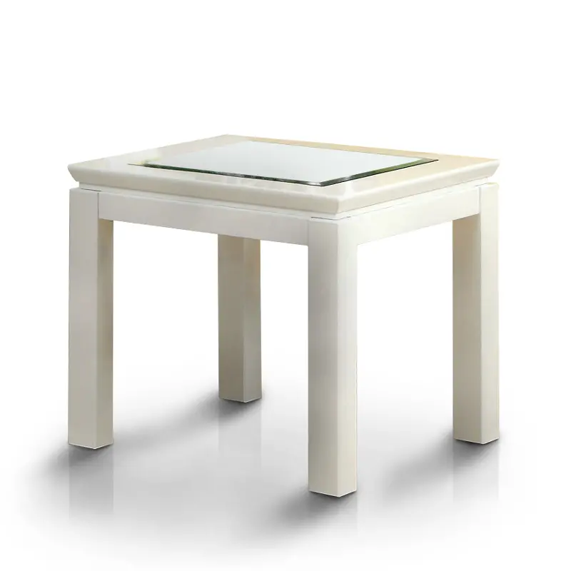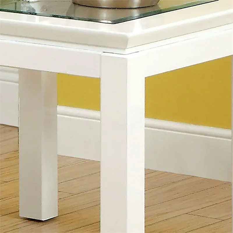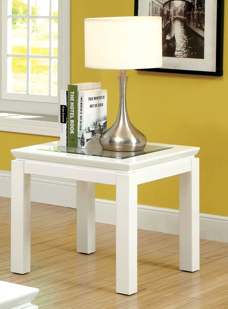 This end table features a glossy white lacquer coat finish with a 5mm tempered glass top with plenty of space for books, a table lamp, or other accessories. Solid wood block legs add stability to a table that is ideal for any modern home.