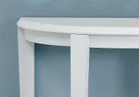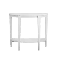 This sofa table is finished in a white wood-look. The curved half-moon shape is complemented by the sturdy tapered legs. Ample surface area and a two-tiered design make this console table perfect for displaying your favorite decorative items.