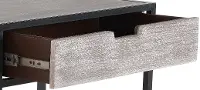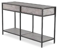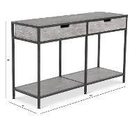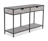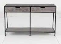 Two front pull drawers offer plenty of storage along with a full open shelf underneath. Keep plants, photos, and more organized and easily accessible, all while adding design and style to your home. The natural wood grain shines through the gray finish, while the black metal frame adds the perfect amount of contrast. This table stands strong on it's own, or can be paired with the rest of the items in our Edgewood collection for a complete living room design!