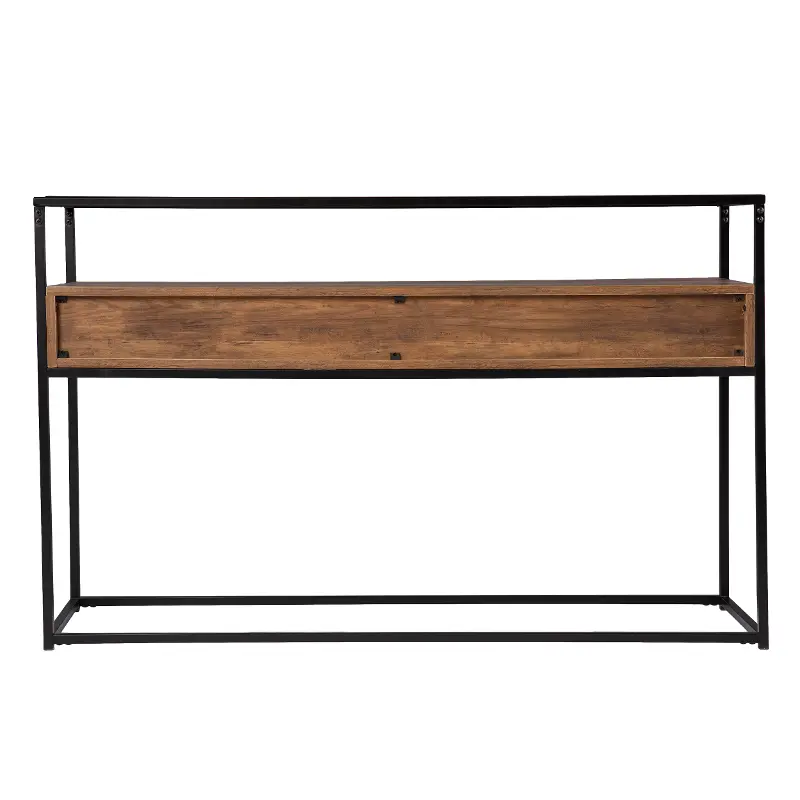 A boxy, open frame crafts a light and airy look, while two convenient storage drawers rest delicately beneath a glass top. Slide behind your sofa to display framed photos or flowers while concealing remotes and electronics inside the hardware-free, push-to-open drawers. Add extra storage without sacrificing your style when you bring home this glass-top console table.