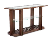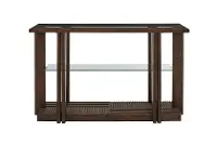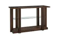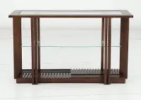 The solid frame and artistic design of this sofa table showcase a modern glass inlay top and a rustic grooved pattern underneath. The rich brown color, contrasted with the clean lines of the glass anchors any room with function and style.
