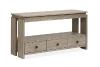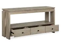 With a sturdy construction from premium materials, this table boasts a Stone Harbor gray finish and effortlessly complements various rustic-inspired home aesthetics, adding a touch of natural beauty. The spacious tabletop offers plenty of space for your home decor, flowers, or books. Three roomy drawers below the fixed shelf are perfect for storing extra items. This piece is highlighted by a French dovetail design on the front and an English dovetail design on the back. Levelers help to keep everything even and secure.