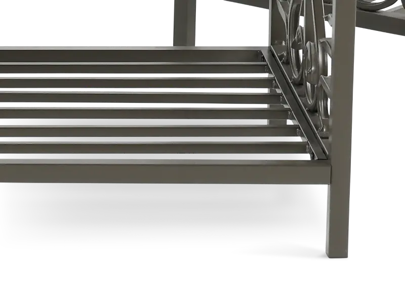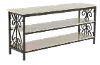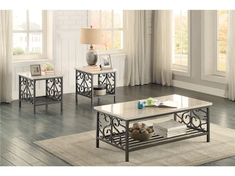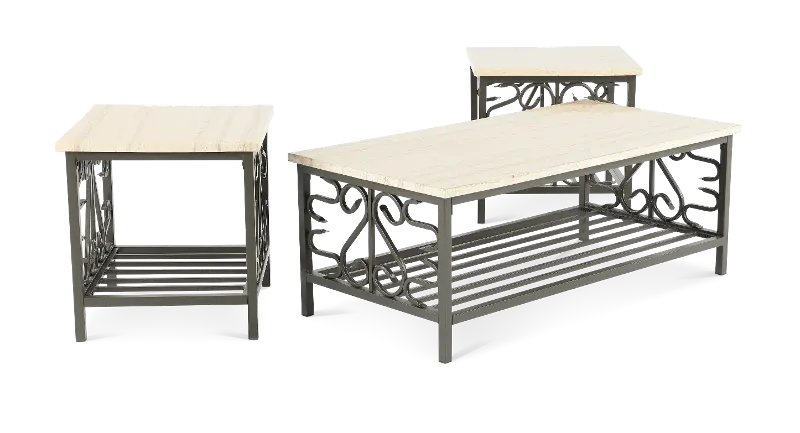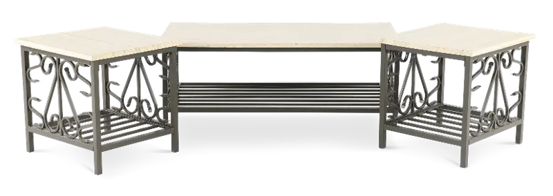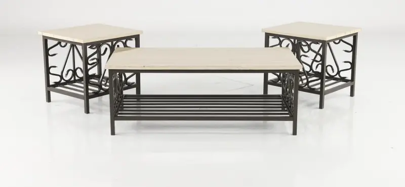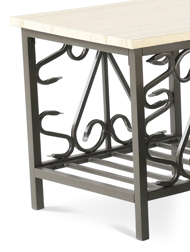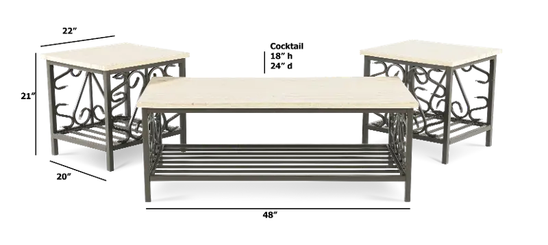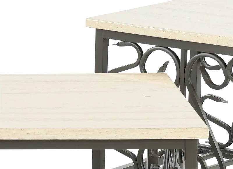 The transitional style of the dark brown metal scrollwork sides and lower shelves supports and frames these tables from the Fairhope Collection. The faux cream marble table tops finish off the elegant look of these pieces.