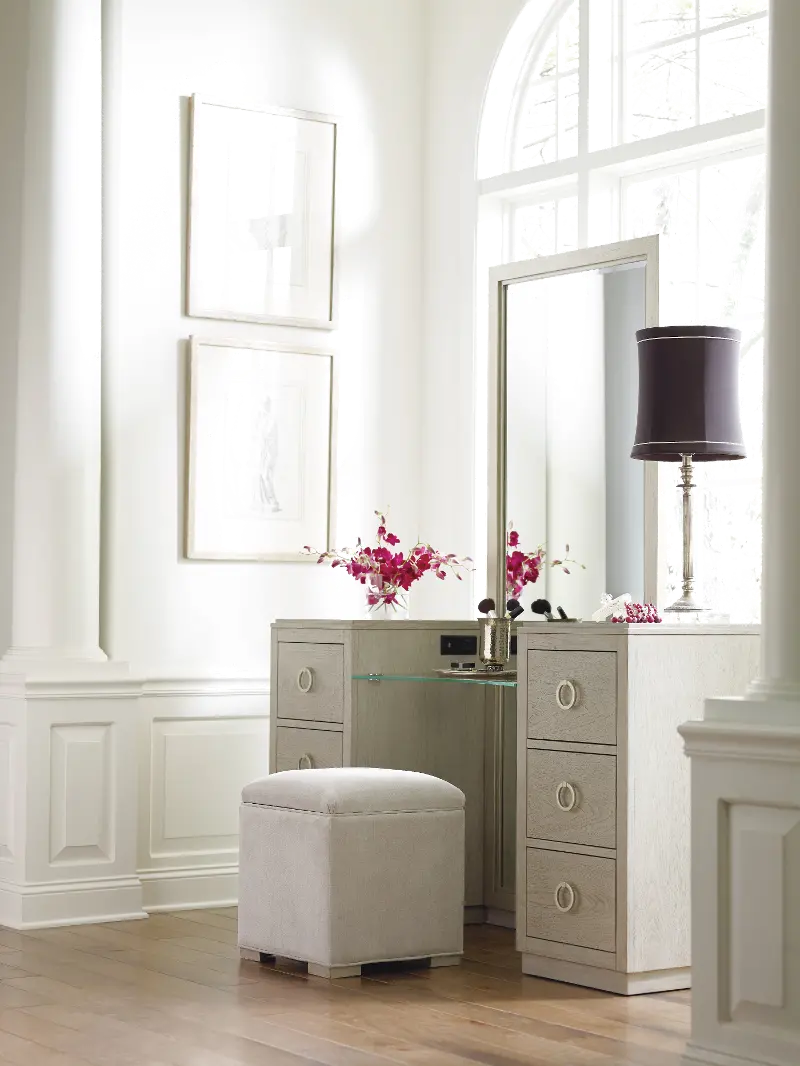 The streamlined Cinema gray upholstered vanity stool from the Rachael Ray Home collection, offers the perfect amount of modern styling and retro flair and RC Willey has it!
