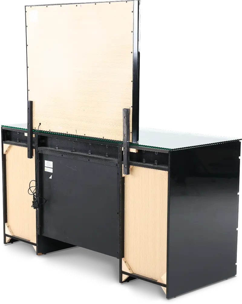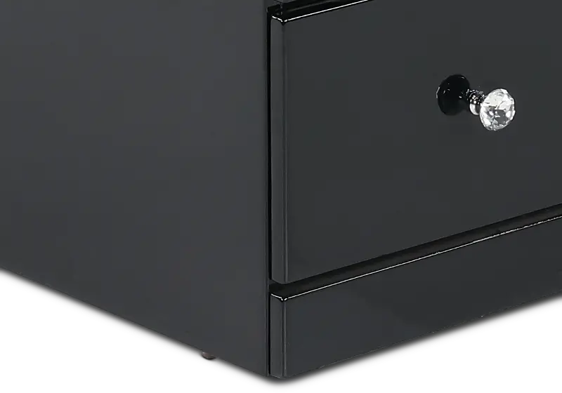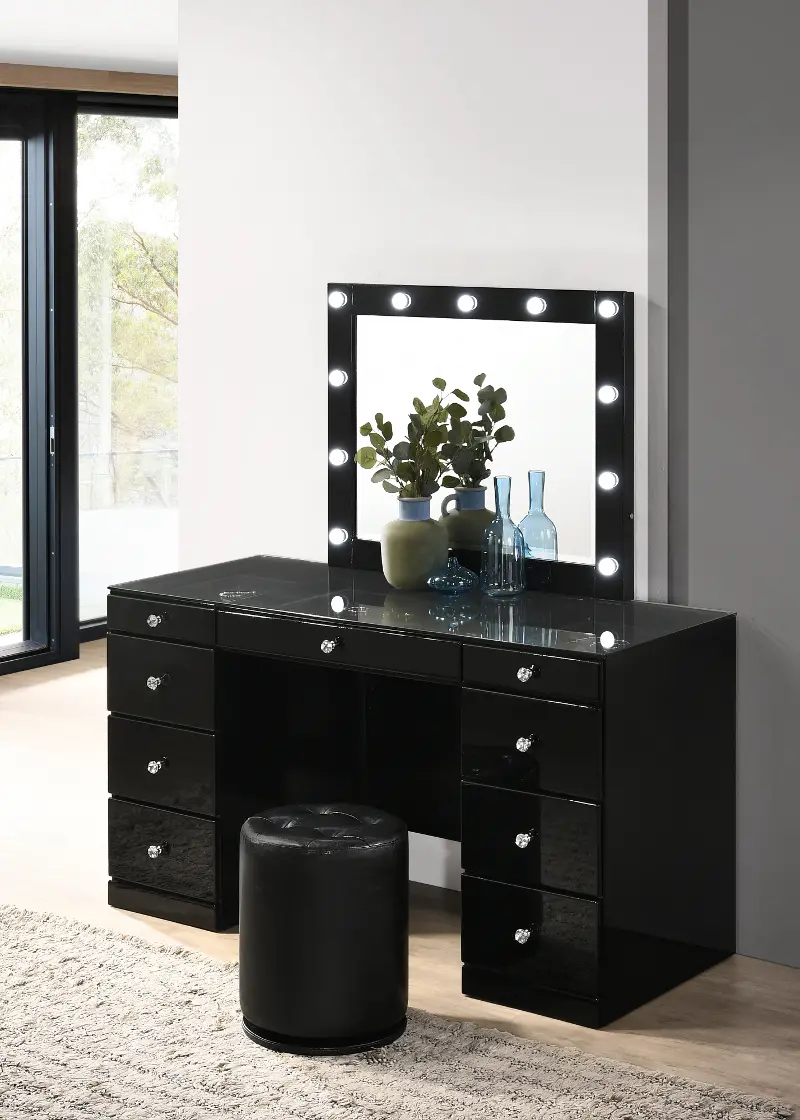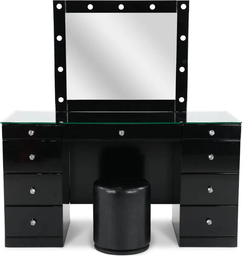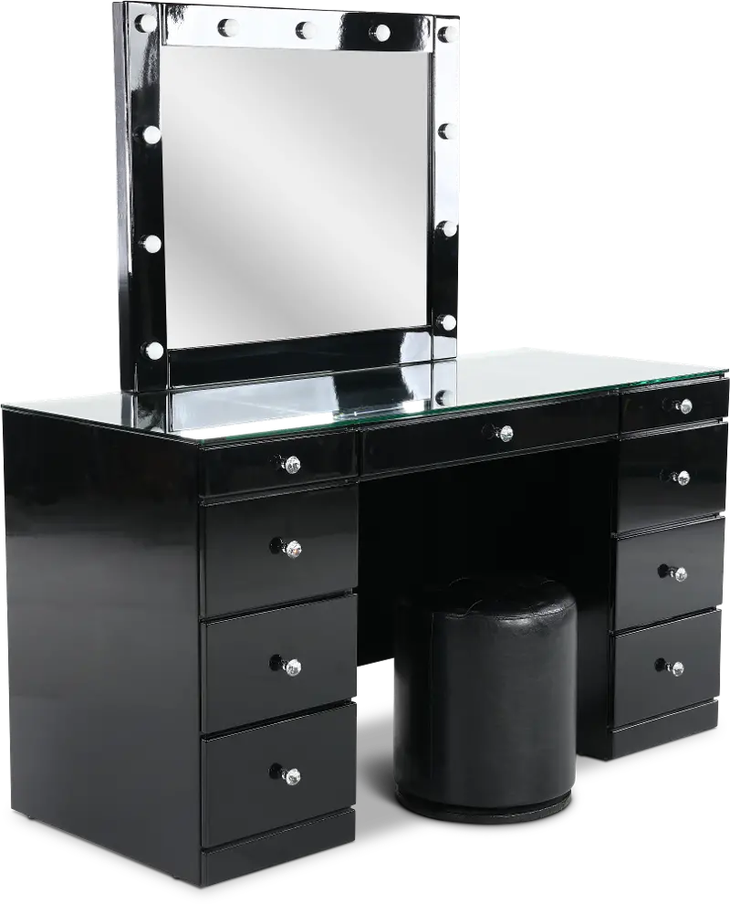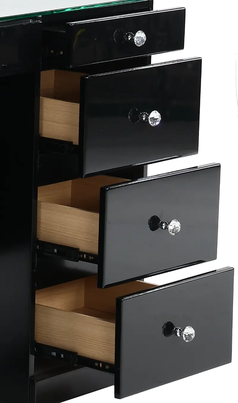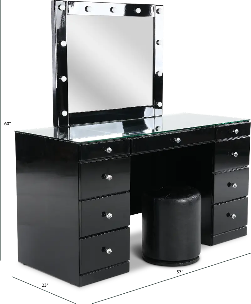 Its chic, clean lines are finished in a bold obsidian black. It features 3 display drawers across the top and 3 storage drawers on both sides with a tempered glass top. The matching mirror with LED lights adds a touch of old Hollywood glamour! Plus, the black upholstered swivel stool adds even more style and function to the vanity set.