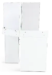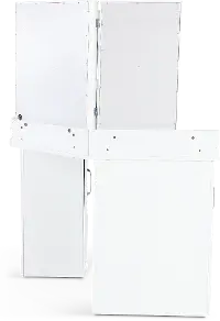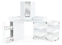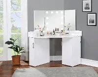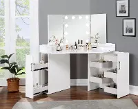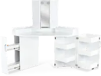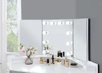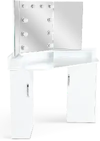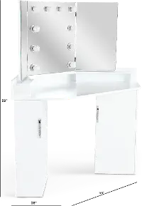 Stay organized and tidy with a two-tier shelf on one side and a movable shelf with casters on the other. The tri-fold mirror will keep things illuminated with its 10 light bulbs, while a fresh white finish complements any decor.