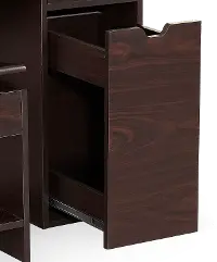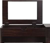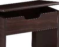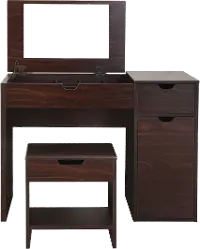 Including a vanity and stool, this set features charming notched drawer openings and a warm walnut finish. Find sectioned space under its flip-open top, as well as a bonus mirror. There’s room for accessories in a conventional side drawer atop a deeper drawer with two shelves. You can also store items under the seat of the stool!