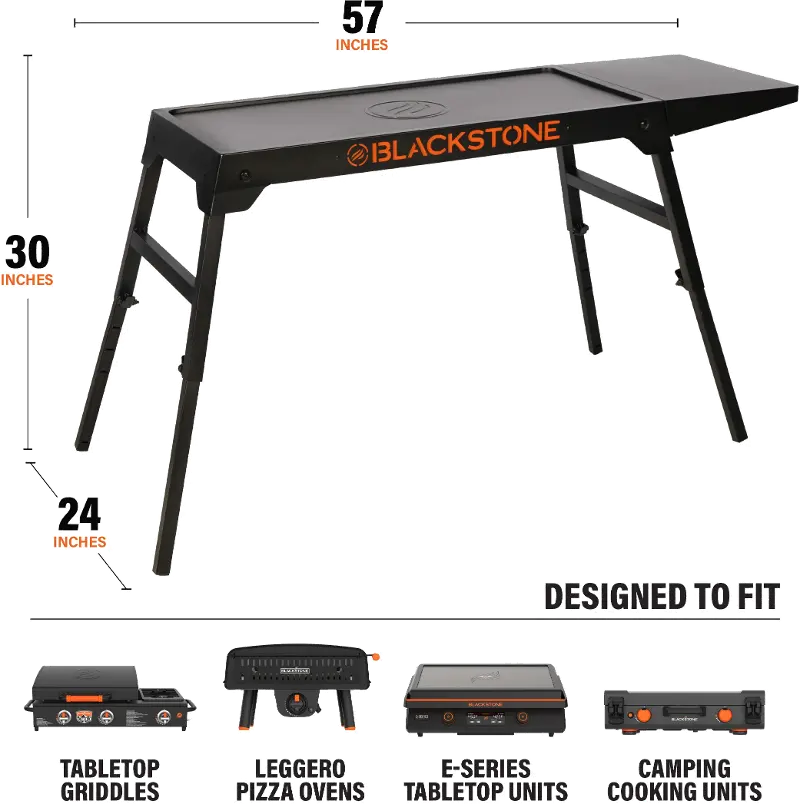 With the ability to fit tabletop griddles, pizza, and camping units, it also offers extra prep space with a convenient side shelf. Folding legs offer quick height adjustment and locking clips for security and help you to easily tuck it away when not in use. Take this useful table with you on your next outdoor adventure and make a great time even better.