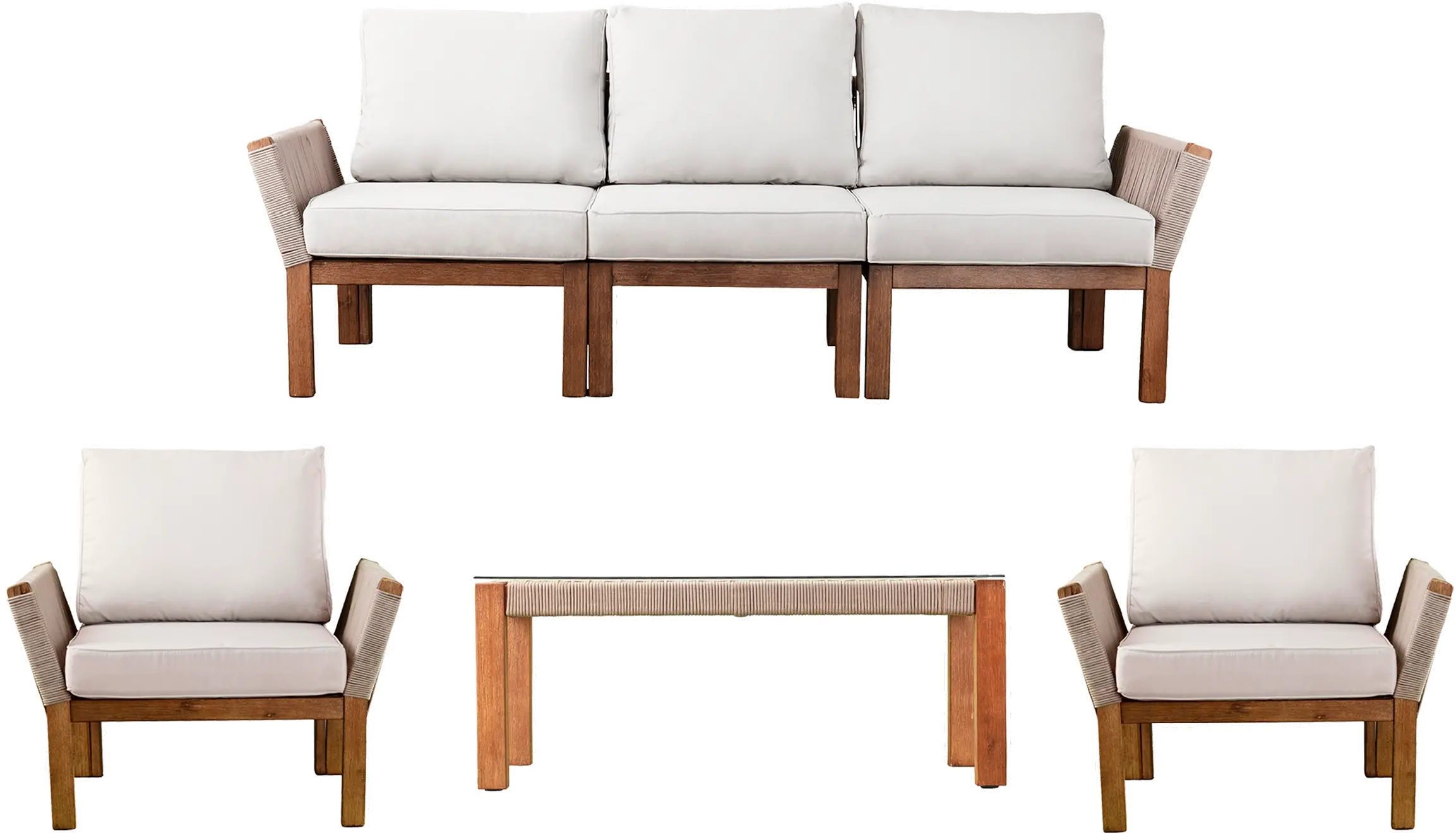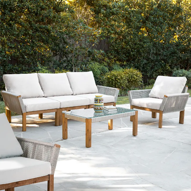 Sturdy acacia frames set the stage for weather-resistant rope accents, weaving sophisticated style throughout your backyard oasis. Serve drinks and appetizers from the sleek, glass-top coffee table, while cozy removable cushions keep guests comfortable and coming back for more. Add this patio seating set beneath your pergola and enjoy casual dinner parties under the stars, or slide onto your screened-in porch to organize memorable family dinners all year round.